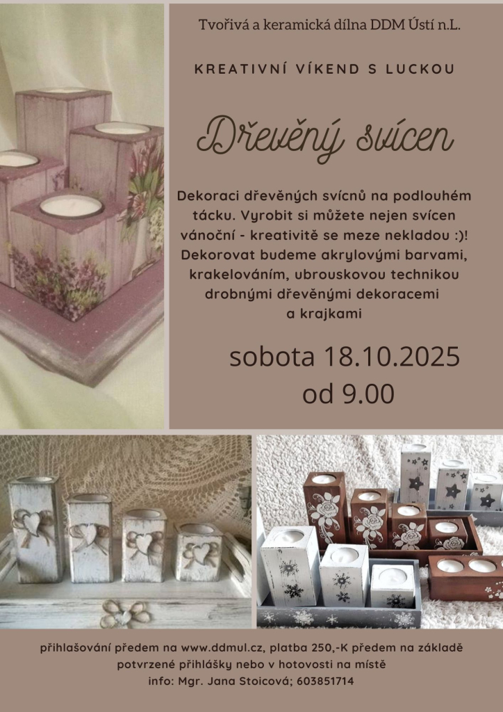 Přijďte strávit tvořivé dopoledne do dílny Kreativky v ateliéru Tvořivé a keramické dílny! V sobotu 18. října 2025 od 9.00 hodin. Kreativní víkend je tentokráte zaměřen na dekoraci dřevěných svícnů na podlouhém tácku. Vyrobit si můžete nejen svícen vánoční - kreativitě se meze nekladou :)! Dekorovat budeme akrylovými barvami, patinováním, ubrouskovou technikou i drobnými dřevěnými dekoracemi. Lektorka vám s výběrem vhodné techniky pomůže. Přihlašování online na našich stránkách Platba předem na účet na základě schválené přihlášky nebo v hotovosti na akci.