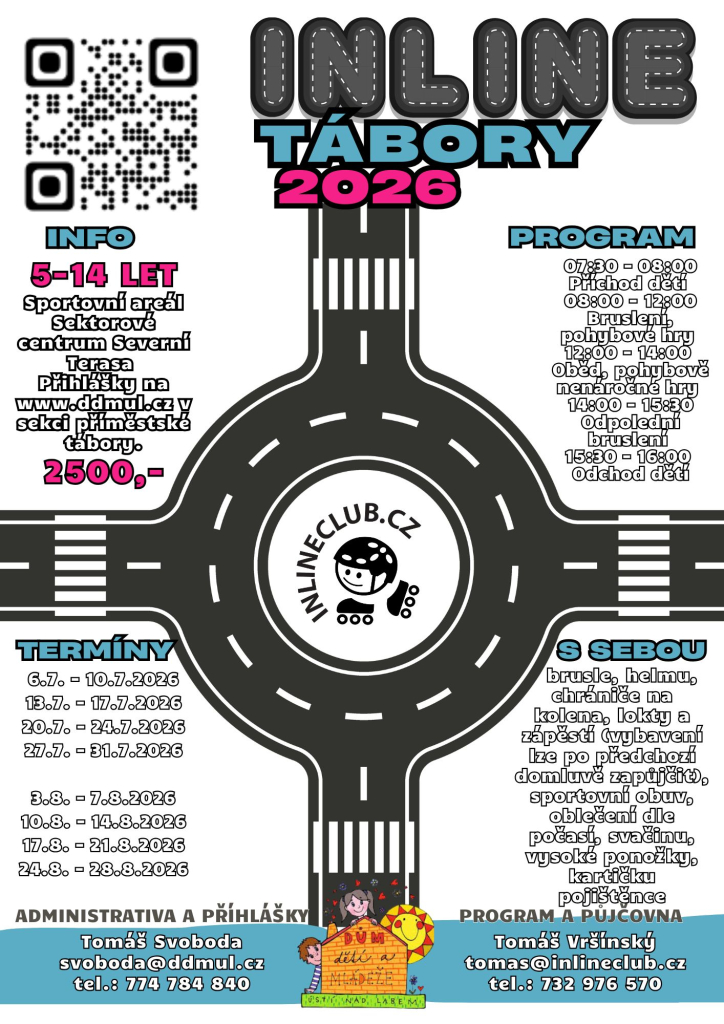 Pro vaše děti je od úterý do pátku připraven program založený na in-line bruslení zakončený pátečním vystoupením dětí od 15 hod. Kromě toho si děti vyzkouší mnoho jiných sportů a her. Tábor bude probíhat na sportovišti pod obchodním domem Albert, vedle bývalého hotelu Máj. V případě špatného počasí se uchýlíme do prostor UJEP v ul. Hoření.